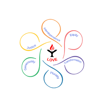 Our UU Values affirm that Love is central to all that we do. Our program for children and youth helps our young people make sense of the world and to reflect on the choices they make using the language of our UU Values, expressed as Rainbow UU Promises for children.
